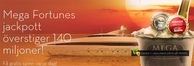 Jodå, det är sant. Just nu är jackpot på casinospelet Mega Fortune uppe i svindlande 140 miljoner! Helt otroligt. Varje dag ger betsson 5 gratis spel tills dess att jackpotten faller ut. Så ta 5 gratischanser varje dag i jakten på denna storvinst som kan förändra ditt liv för all framtid.
